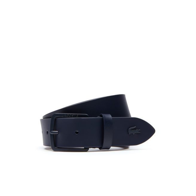 Este elegante cinturón de piel liso y mate está dotado de una hebilla de lengüeta y un cocodrilo de metal en la punta. Unos bordes francos soldados firman este complemento masculino.